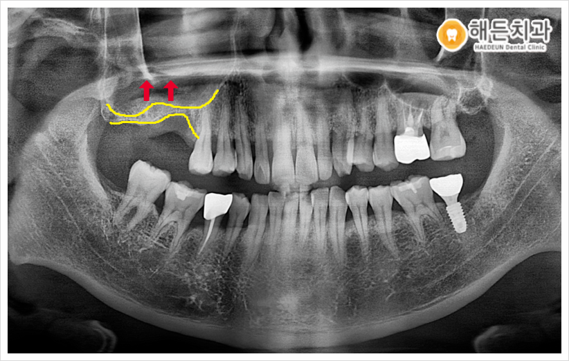 치아가 상실된 부위의 잇몸뼈가 많이 얇고, 또한 상악동이 내려와 있어서 임플란트를 심기에는 잇몸뼈가 충분하지 않았습니다.