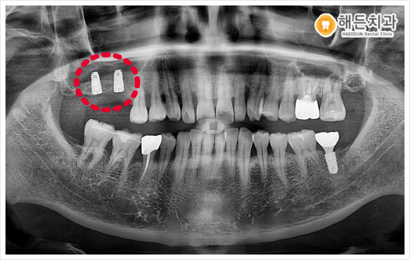 상악동 거상술을 통해 부족한 뼈를 보강하여 임플란트를 안정적으로 식립하였고, 임플란트 식립 후에 픽스처 주변으로 잇몸뼈가 부족한 부분에도 인공뼈를 이식해 드렸습니다.