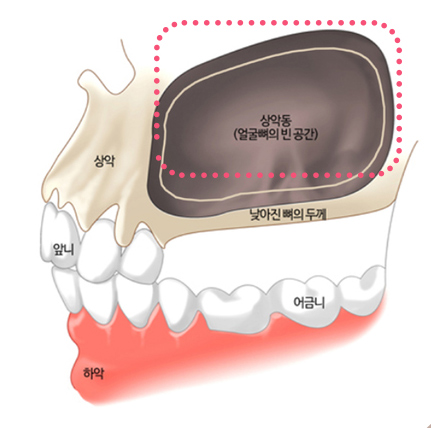 상악동이란~? 코 옆 양측의 위 잇몸뼈와 광대뼈 사이의 빈 공간으로 상악동막을 들어 올려 뼈를 이식할 공간을 확보한 뒤 인공뼈를 이식하는 술식을 상악동 거상술이라고 합니다.