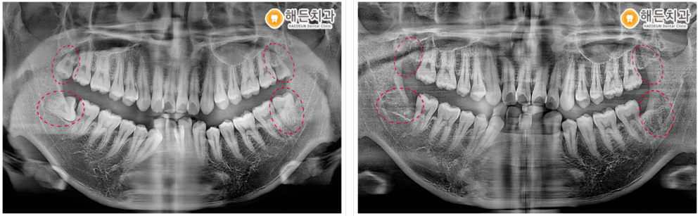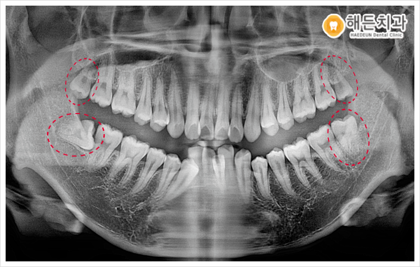 파노라마 사진을 촬영하여 확인해 보았더니 사랑니가 위아래 모두 맹출이 되어있었으며, 오른쪽 아래를 제외한 나머지 3개는 비교적 올바른 방향으로 맹출이 되어있었는데요.