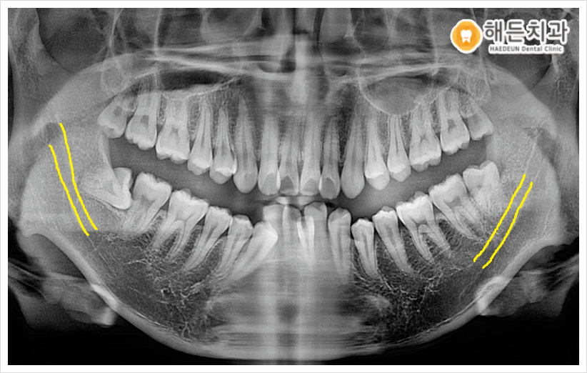그리고 파노라마 사진상에서 아래턱 하방으로 지나가는 하치조 신경과 사랑니가 인접해 있는 것을 확인할 수 있었는데요.