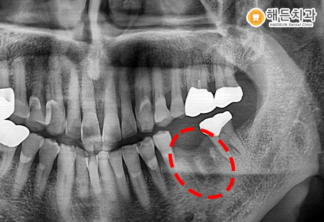 발치 후에 염증이 나타나 잇몸뼈가 많이 녹아있는 모습이 더욱 잘 나타나 있습니다.