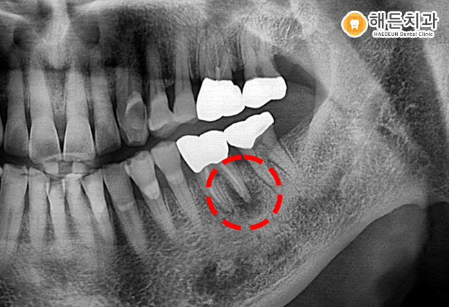 X-Ray 사진으로 보았을 때 빨간색 점선으로 표시된 하악 왼쪽(사진상으로 오른쪽) 어금니 뿌리 끝을 자세히 보시면