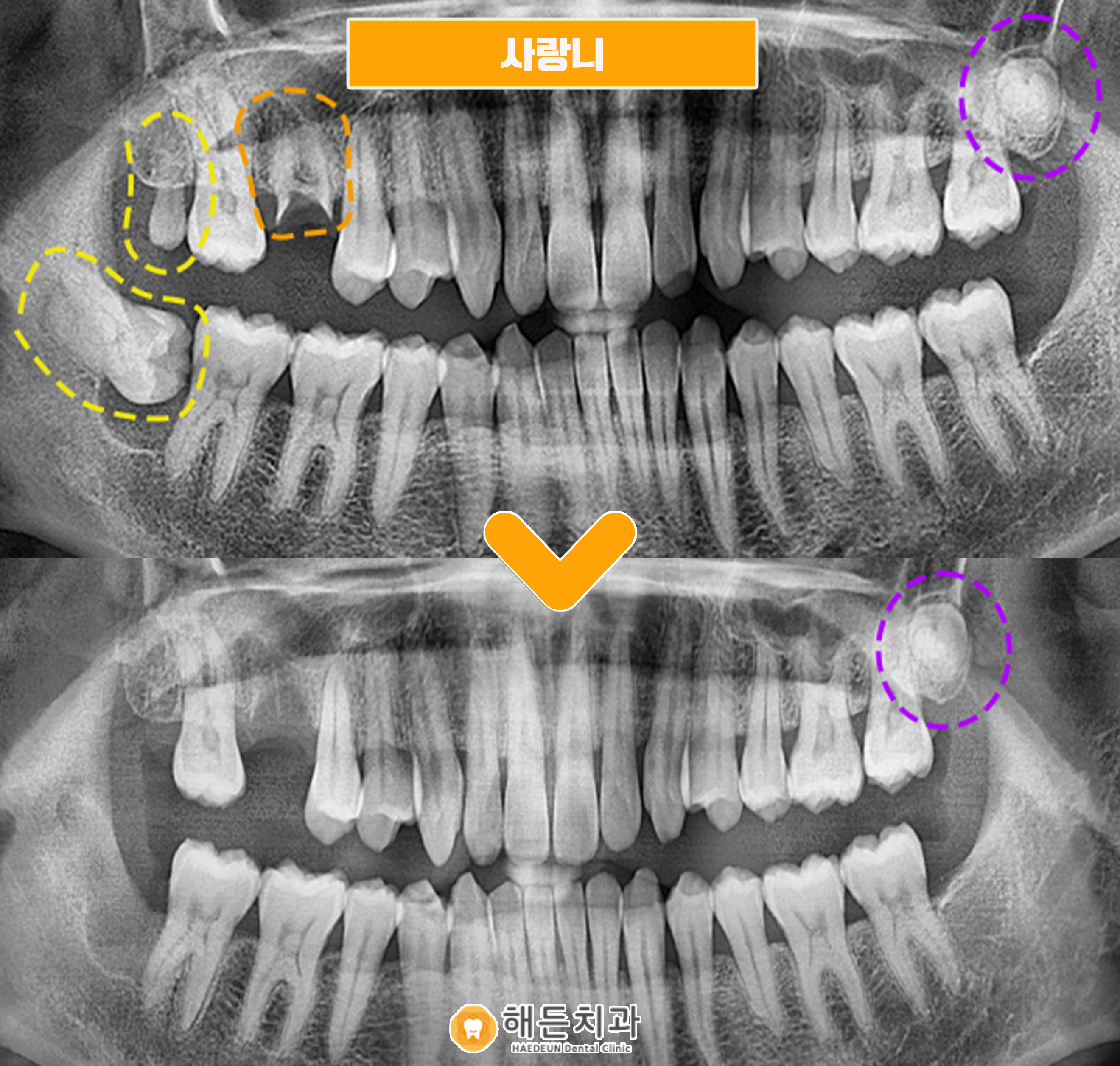 오른쪽 위와 왼쪽 위의 사랑니는 다행히 크기가 작고 잇몸 위로 맹출되기 전이라, 환.자분께서 따로 불편감은 느끼지 않으신 상태였습니다.