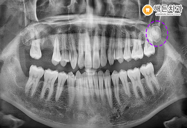 아직 왼쪽 위의 사랑니는 잇몸 위로 맹출되지 않았으며,